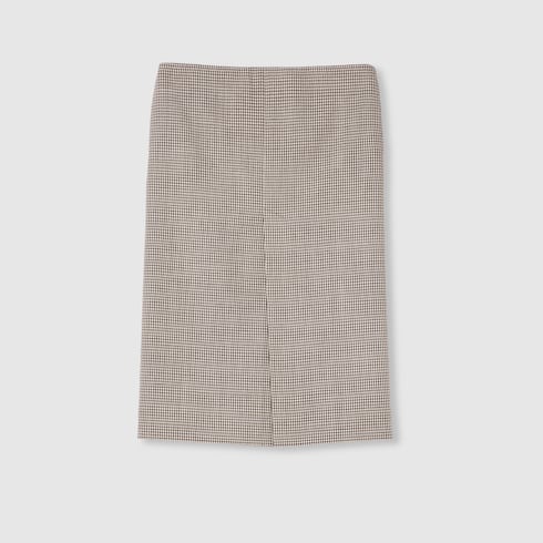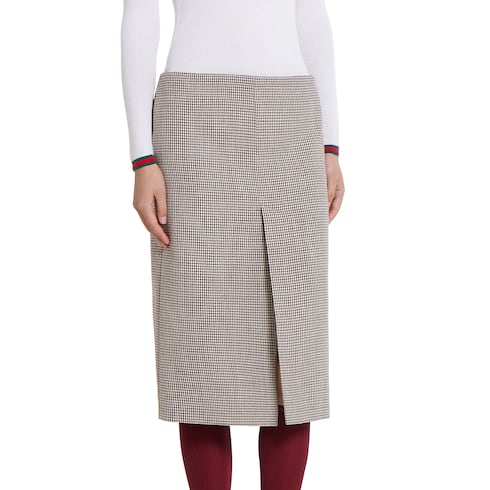 Die Mäntel, Jacken und Kleider aus der Pre-Fall 2025 Kollektion vereinen subtile Eleganz mit raffinierten Details. Dieser stilvolle Rock mit Seiten- und Gesäßtaschen ist aus Wolle mit Vichykaro gefertigt. Eine Gucci Stickerei rundet das Design ab.