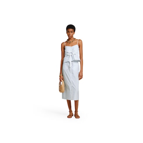 Maritime Designs, inspiriert vom Meer, verleihen der Pre-Fall 2025 Kollektion mit Streifen und unverwechselbaren Motiven eine frische Note. Dieser Midirock ist aus gestreifter Gucci Baumwolle mit Fil Coupé gefertigt und verfügt über eine Knopfleiste auf der Vorderseite.