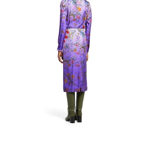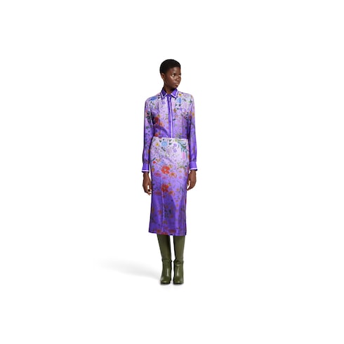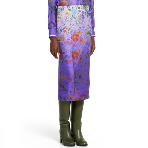 Der Flora-Print aus den Archiven der 1960er wird auf den Ready-To-Wear-Modellen zu neuem Leben erweckt und für Pre-Fall 2025 in frischen Farben und Farbverlaufdesigns mit romantischer Note präsentiert. Hier erscheint der Print auf einem Rock aus Seidentwill mit einer besonderen Optik, die zum Saum hin dunkler wird.