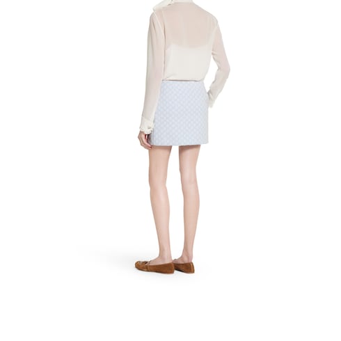 Die Pre-Fall 2025 Auswahl umfasst essenzielle Silhouetten mit symbolträchtigen Details für den Tag und den Abend. Mit seinem Design aus GG Baumwollbouclé ist dieser Minirock eine Hommage an das unverkennbare Monogramm von Gründer Guccio Gucci.