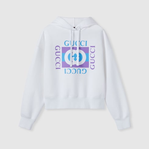 Prints oder Stickereien verleihen den alltagstauglichen Designs aus der Pre-Fall 2025 Kollektion eine lässige Note. Dieses Sweatshirt aus Baumwolljersey-Doppelgewebe verfügt über eine nicht abnehmbare Kapuze und einen Gucci Vintage-Logo-Print auf der Vorderseite.