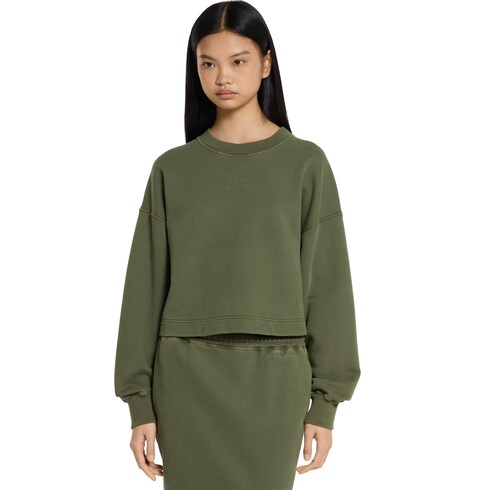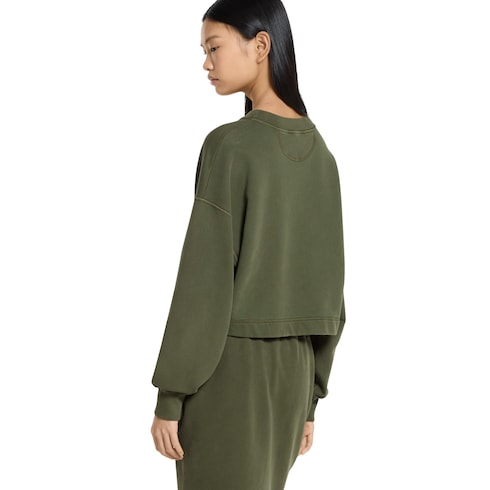 Wie auf dem Laufsteg gesehen, bestimmen nuancierte Grüntöne das Farbnarrativ der Pre-Fall 2025 Kollektion, während sie Strukturen und Logo-Details eindrucksvoll in Szene setzen. Bei diesem Sweatshirt aus Baumwolljersey wird die charakteristische Farbe mit einer Gucci Stickerei kombiniert.