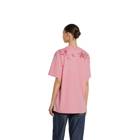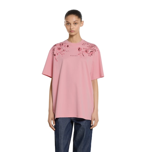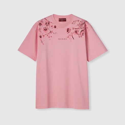 Stilvolle Prints oder Stickereien verleihen den alltagstauglichen Designs aus der Pre-Fall 2025 Kollektion eine lässige Note. Dieses T-Shirt aus weichem Baumwolljersey wird vorne an den Schultern von einem Gucci Blumen-Print geziert.