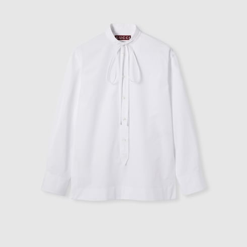 Mit einer monochromen Farbpalette und zarten Akzenten wie Stickereien oder Logo-Details schafft die Pre-Fall 2025 Kollektion eine Garderobe, die sich perfekt tagsüber wie auch abends tragen lässt. Diese Bluse aus Baumwollpopeline verfügt über einen Stehkragen mit zarter Schleife zum Binden und wird vorne an der Knopfleiste von einer Doppel G Stickerei komplettiert.