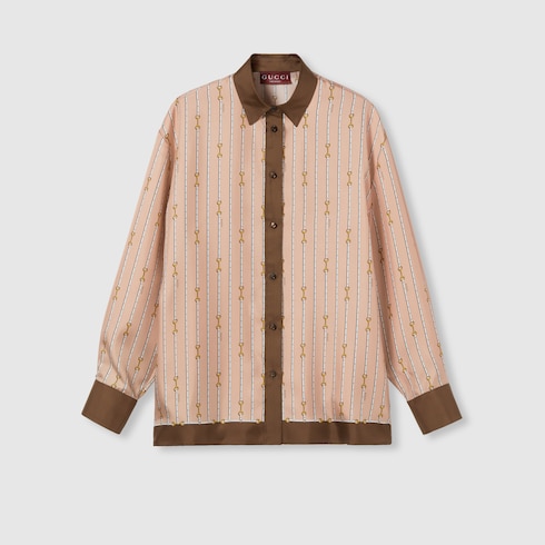 Im Rahmen der Pre-Fall 2025 Kollektion setzen leuchtende Farben und aufsehenerregende Prints einen besonderen Akzent in der Ready-To-Wear-Auswahl für die Übergangszeit. Diese Bluse aus Seidentwill wird von einem durchgehenden Gucci Horsebit-Gürtel-Print geziert.