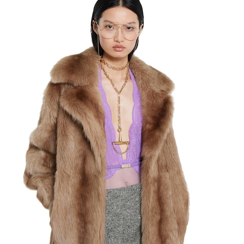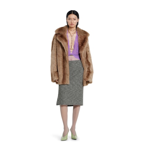 Dieser Body aus der Herbst Winter 2025 Kollektion wird aus violettem Stretch-Tüll mit Blumen-Spitze gefertigt. Ein abnehmbarer, elastischer Gürtel mit Raffungen und Gucci Schnalle aus Metall verleiht dem Modell mit tiefem V-Ausschnitt den letzten Schliff.