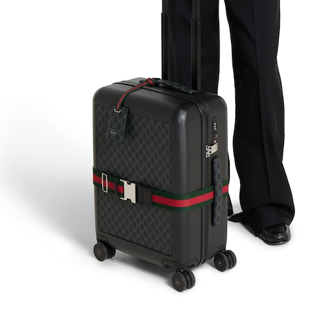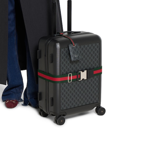 Dieser Gepäckriemen ist Teil der Pre-Fall 2025 Kollektion. Das Design mit dem grünen und roten Web ist mit einem gravierten Schmetterlingsverschluss versehen und verfügt über einen schwarzen Lederbesatz. Der Riemen kann als zusätzlicher Verschluss für zahlreiche Gucci Trolleys verwendet werden.