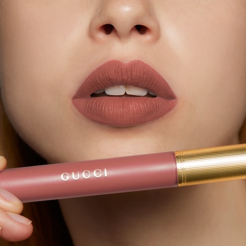 Gucci Rouge à Lèvres Liquide Mat has a transformative cream-to-powder texture with a transfer-proof soft-matte finish. The highly pigmented color changes from a creamy liquid to a powdery-matte texture for a smoothed effect and lightweight feel, without smudging or transferring. Created with comfort in mind, it cares for the lips while providing intense color. This lipstick is presented in the Valeria Rose shade, a classic soft pink perfect for adding a touch of romance to the lips.