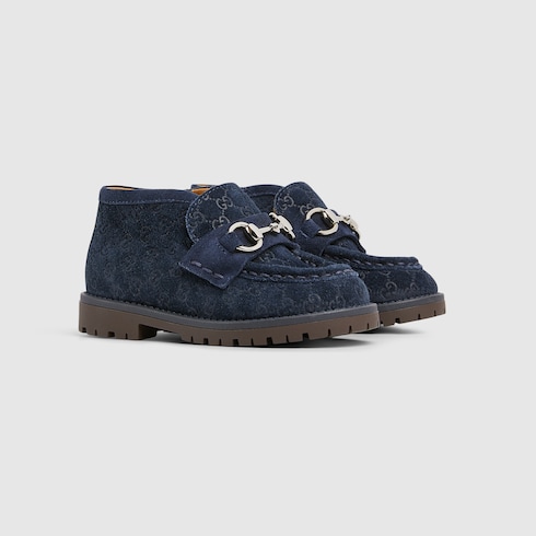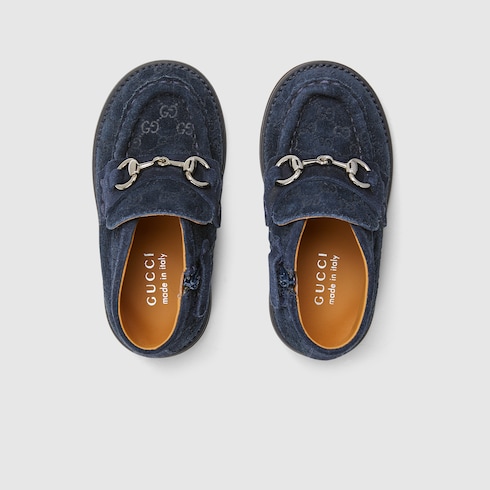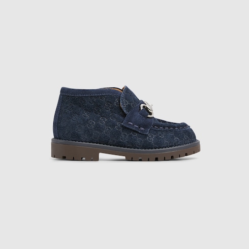 From subtle embroideries to allover prints, signature motifs continue to enrich the Pre-Fall 2025 children's selection. These toddler ankle boots are presented in GG suede and defined by a silver-toned Horsebit detail.