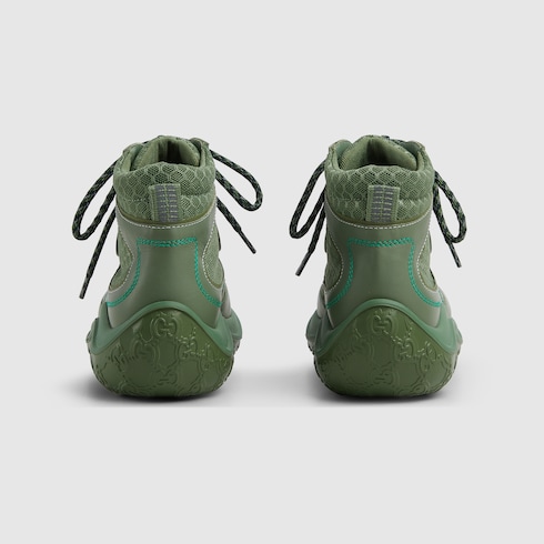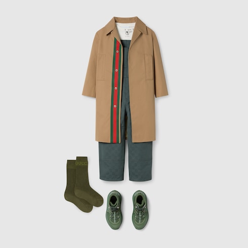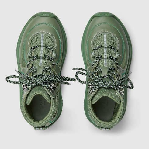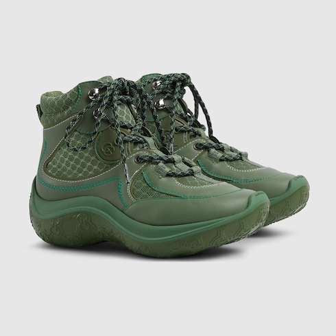 The children's Pre-Fall 2025 collection presents a range of beloved motifs, including signature logo details. These children's ankle boots are presented in green leather and a tonal mesh, further enriched with a Double G and rubber sole with GG pattern.