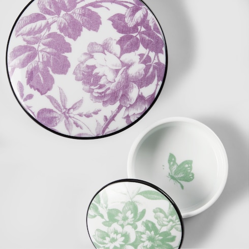 The House's Decor collection continues to reinterpret emblematic motifs, from the GG, Web, bamboo, Horsebit and equestrian inspirations, in sumptuous materials, intricate craftsmanship, and fresh hues. This round box is stated in Ginori 1735 porcelain and features a delicate Herbarium print.