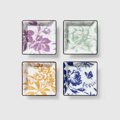 The House's Decor collection continues to reinterpret emblematic motifs, from the GG, Web, bamboo, Horsebit and equestrian inspirations, in sumptuous materials, intricate craftsmanship, and fresh hues. This trinket tray set is stated in Ginori 1735 porcelain and features a delicate Herbarium print.