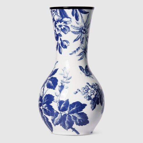 The House's Decor collection continues to reinterpret emblematic motifs, from the GG, Web, bamboo, Horsebit and equestrian inspirations, in sumptuous materials, intricate craftsmanship, and fresh hues. This vase is stated in Ginori 1735 porcelain and features a delicate Herbarium print.