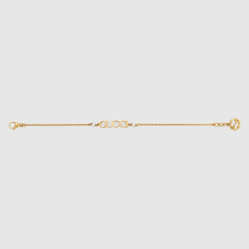 Gucci script enhances its sculptural appeal with two new dimensions. The fashion jewelry collection, which comes in yellow gold tone and rose gold tone, comprises bracelets, necklaces, single earrings, and signet rings. This bracelet in gold-toned metal features the sculptural Gucci logo.
