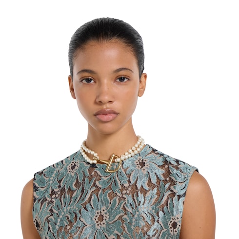 The House's fashion jewelry collection continues to reinterpret emblematic motifs with sumptuous materials, intricate craftsmanship, and a refined touch, like the stirrup detail on this necklace.
