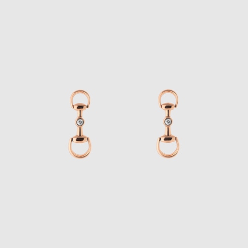 Gucci celebrates the 20th anniversary of the signature Horsebit jewelry line with classic and iconic pieces in 18k rose gold with diamonds. This pair of stud Horsebit earrings is enriched by two sparkling white diamonds.