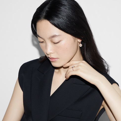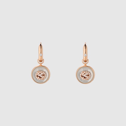 The Interlocking G logo appears in elegant new interpretations for Pre-Fall 2024. Refined rose gold is complemented by iridescent mother-of-pearl stone and a pavé of diamonds. This hoop earrings can be matched with other accessories from the same line.