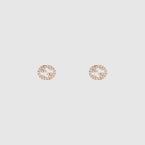 The Gucci Interlocking jewelry collection takes a cue from the geometric logo, resulting in criss-cross bands, GG Pavé rings, as well as single earrings, Hoop GG earrings, and more set with diamonds, in plain yellow or rose gold. These Interlocking G diamond stud earrings transition effortlessly from day to evening.