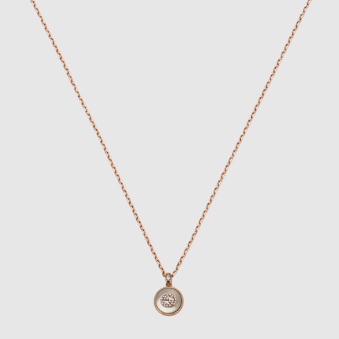The Interlocking G logo appears in elegant new interpretations for Pre-Fall 2024. Refined rose gold is complemented by iridescent mother-of-pearl stone and a pavé of diamonds. This chain necklace can be matched with other accessories from the same line.