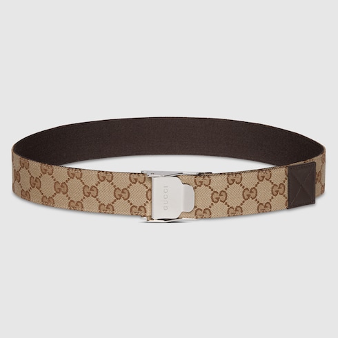 Men's belts in plain or logoed canvas include a sporty buckle with slide closure for effortless style. Here, the statement buckle is enriched with a Gucci engraving detail across a GG canvas belt.