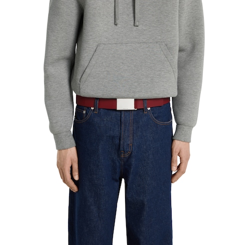 Men's belts include square plaque buckle styles engraved with the Gucci logo for a subtle touch. Here, it appears atop a smooth matte leather belt.