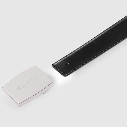 The men's belts collection highlights a sleek squared plaque buckle. The reversible style is embellished with a Gucci logo.
