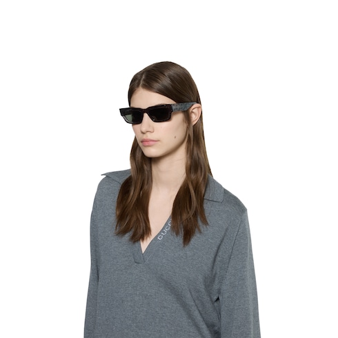 The Pre-Fall 2025 eyewear collection blends a sleek silhouette and signature motifs in a contemporary design. These rectangular sunglasses feature an allover GG motif on the dark grey acetate frame and temples.