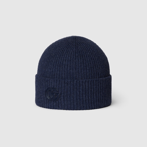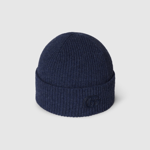 The Pre-Fall 2025 soft and silk accessories collection animates House codes through sophisticated trimmings, logo patches and subtle embroideries. This hat is stated in dark blue cashmere with a Double G leather patch.