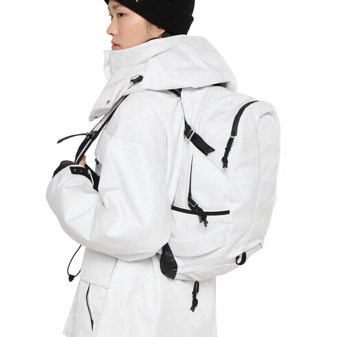 Gucci Altitude, the House's first winter sportswear collection, combines advanced performance and signature codes. Crafted from GG nylon jacquard, this small backpack is enriched with a black trim and a green and red Web detail.