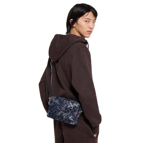 In the Fall Winter 2025 collection, GG denim evolves with a tonal camouflage effect. Here it's presented across this small crossbody bag, further defined by a green and red Web detail.