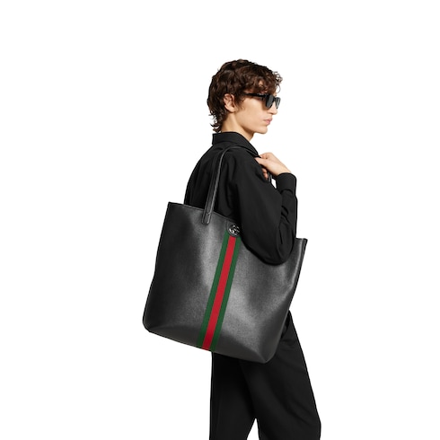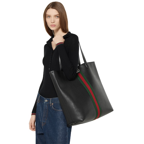Ophidia in black features sophisticated leather, elevating signature silhouettes with new functions. This tote bag is presented in a soft leather with natural shine and is defined by a Double G and a Web detail.