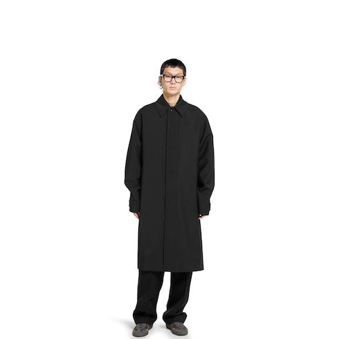 Pre-Fall 2025 pieces in muted black, grey and green tones spotlight delicate floral embroideries, embossed logos, and more craftsmanship details. Crafted from black bonded wool, this coat reveals an embossed Gucci logo under the collar.