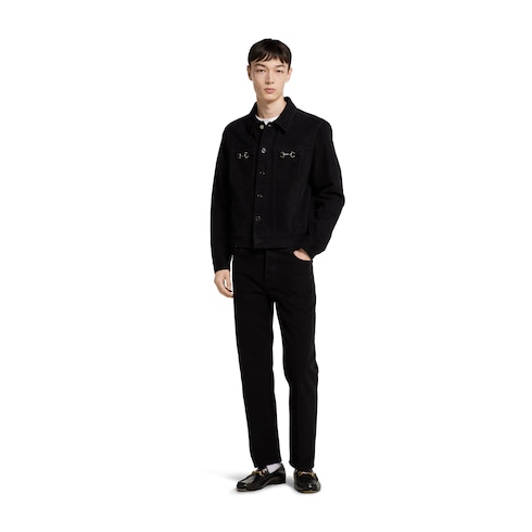 Pre-Fall 2025 pieces in muted black, grey and green tones spotlight delicate floral embroideries, embossed logos, and more craftsmanship details. Crafted from black cotton denim, this pair of cropped denim pants is enriched with the House's signature Horsebit hardware at the back.