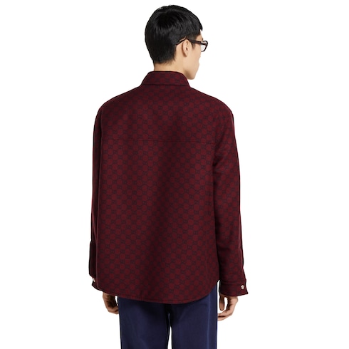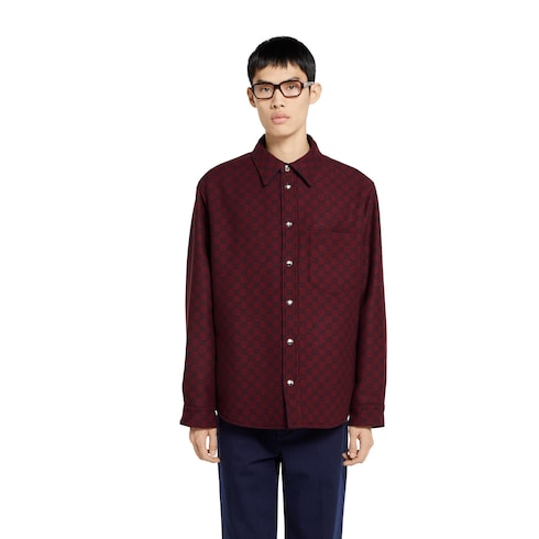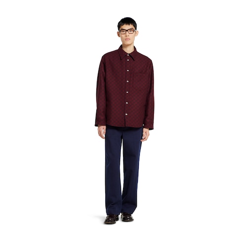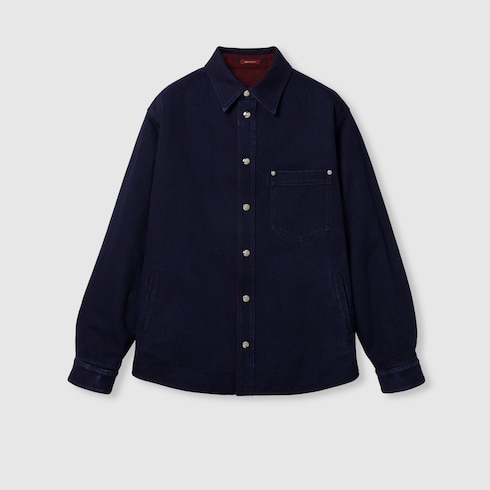 The Pre-Fall 2025 collection features denim pieces with subtle details that elevate everyday looks. This reversible shirt is presented in dark blue washed denim on one side, reversing to red and blue brushed GG flannel on the other. An embossed Gucci label completes the piece.