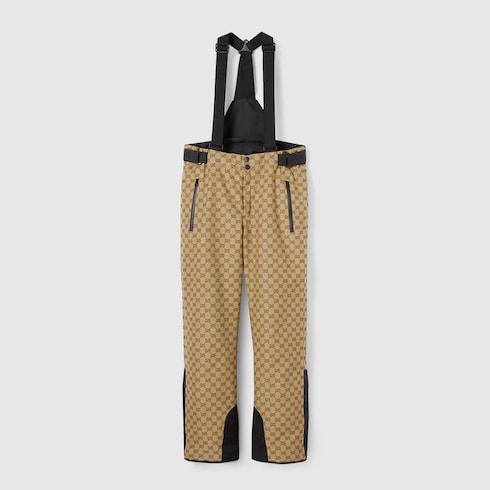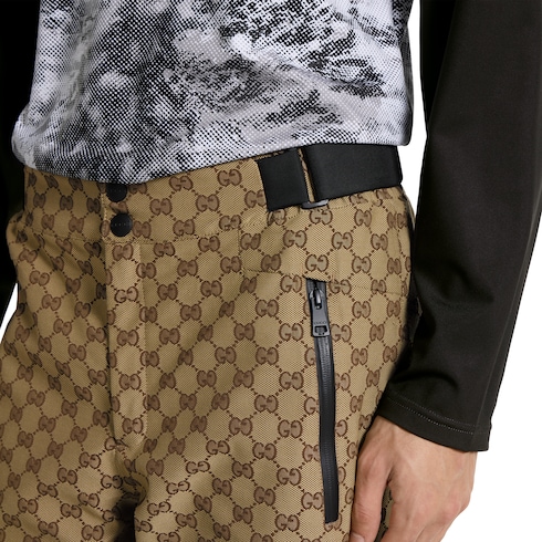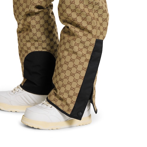 Gucci Altitude, the House's first winter sportswear collection, combines advanced performance and signature codes. This pair of pants appears in beige and dark brown GG technical fabric jacquard with membrane.