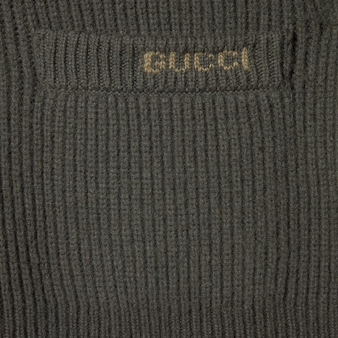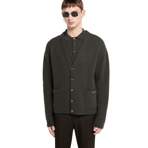 Pre-Fall 2025 pieces in muted black, grey and green tones spotlight delicate floral embroideries, embossed logos, and more craftsmanship details. This wool cashmere rib knit cardigan is enriched with a Gucci intarsia.