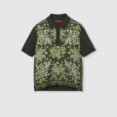 For the Pre-Fall 2025 collection, a selection of ready-to-wear pieces is defined by a bohemian feel in colorful prints and relaxed silhouettes. Crafted from forest green silk and cotton knit, this polo shirt is defined by an allover bandana print.