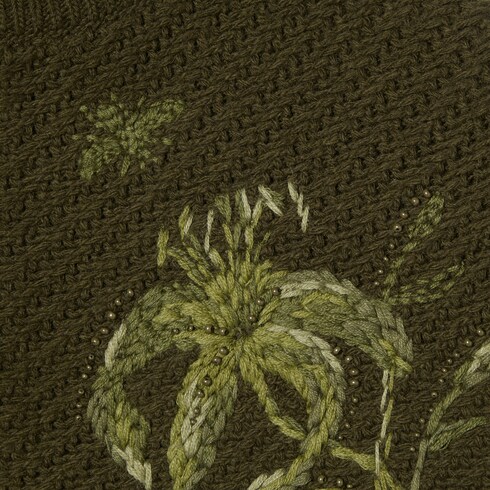 For the Pre-Fall 2025 collection, a selection of ready-to-wear pieces is defined by a bohemian feel in colorful prints and relaxed silhouettes. Crafted from forest green wool knit, this cardigan is defined by a floral embroidery with beads.