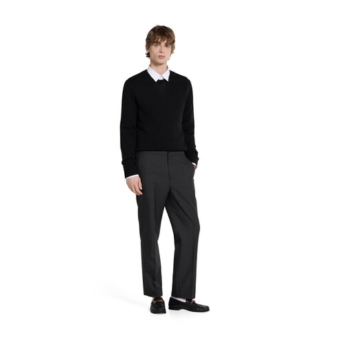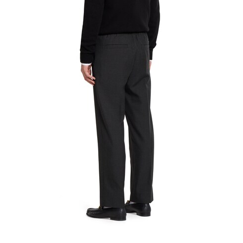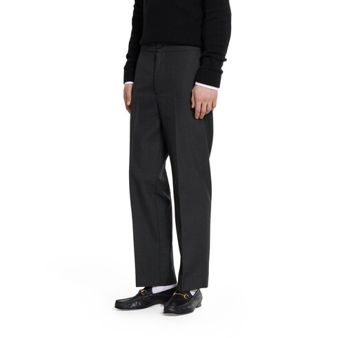 Pre-Fall 2025 pieces in muted black, grey and green tones spotlight delicate floral embroideries, embossed logos, and more craftsmanship details. Crafted from dark grey wool blend twill, this pair of pants is completed with a Gucci metal lettering detail.
