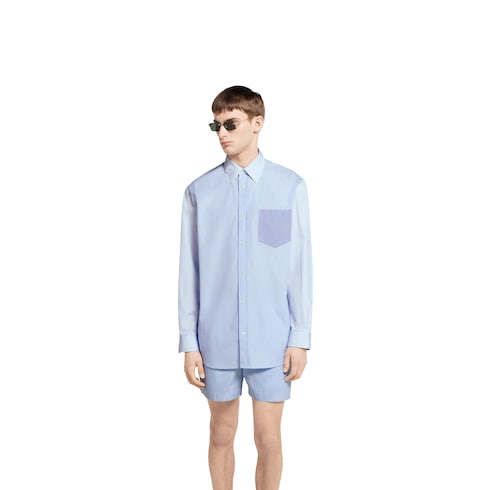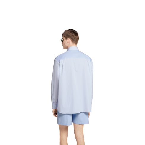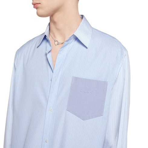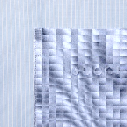 Maritime-inspired designs enrich casual silhouettes perfect for the seaside, featuring stripes, anchor motifs and the House logo in the Pre-Fall 2025 collection. This shirt is presented in light blue and white thin striped cotton and features an embossed Gucci logo.