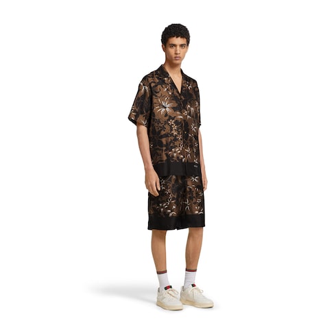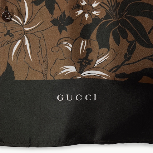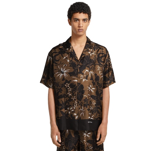 For the Pre-Fall 2025 collection, a selection of ready-to-wear pieces is defined by a bohemian feel in colorful prints and relaxed silhouettes. Crafted from dark brown and camel silk twill, this bowling shirt features an allover floral print combined with the Gucci logo.