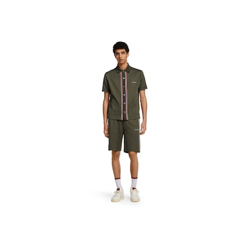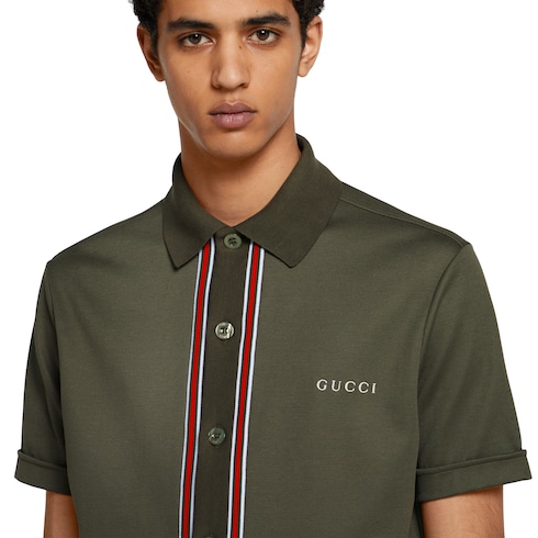 Pre-Fall 2025 pieces in muted black, grey and green tones spotlight delicate floral embroideries, embossed logos, and more craftsmanship details. Crafted from forest green stretch cotton piquet, this polo shirt is defined by a Gucci embroidery and vertical Web stripes.