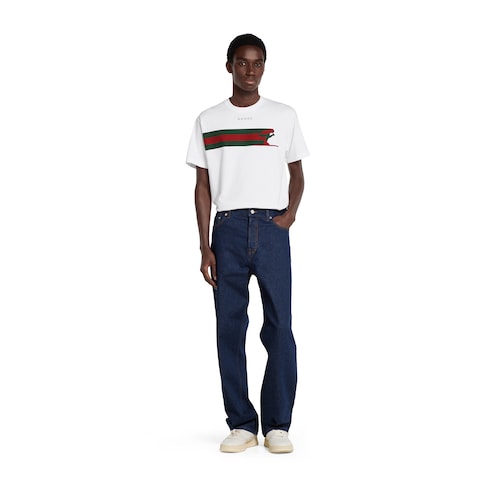 Gucci's House codes continue to evolve for the new season across jersey pieces. This T-shirt is presented in a white cotton jersey and is defined by a Gucci skier Web print.