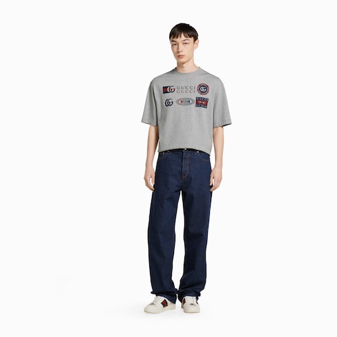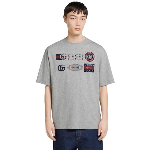 A selection of ready-to-wear pieces is enriched with heritage details of the House. This oversize fit T-shirt is presented in light grey cotton jersey and is defined by a Gucci symbols print, finished with a subtle logo embroidery.