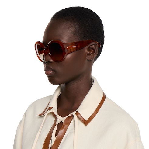 The Pre-Fall 2025 eyewear collection blends an effortless silhouette and signature motifs in a classic design. These sunglasses feature a round frame and a Gucci logo detail with rivets across the temples.