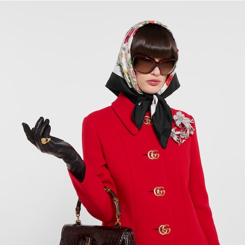 Introducing Spring Summer 2026. This style is featured in the "Incazzata" look of La Famiglia. Silk and soft accessories designs continue to reinterpret emblematic codes through a creative lens. Crafted from a silk twill, it's defined by an allover Gucci Flora print.