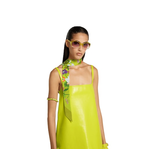 In the Spring Summer 2025 collection, vibrant silk accessories include this ribbon with the Gucci Flora pattern.