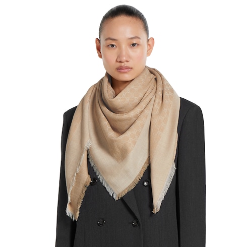 The Pre-Fall 2025 collection presents the GG motif across a wide selection of silk accessories that can be layered. Crafted from a GG denim-effect material in wool silk cotton, this soft shawl is completed with a fringe trim.