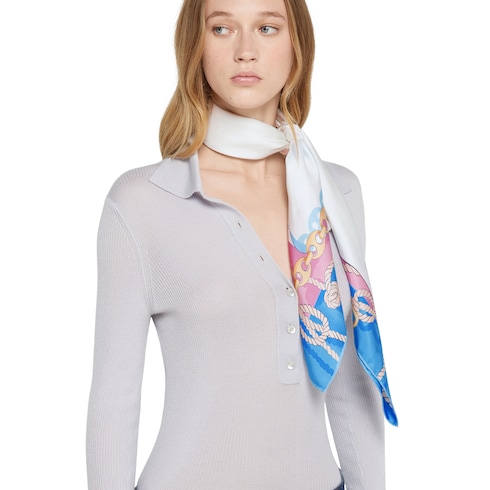 Featuring artwork by illustrator and animator Yu Cai, who blends traditional techniques with digital innovation to explore urban existence, this carré reinterprets Gucci's nautical motif as part of the 90 x 90 project.