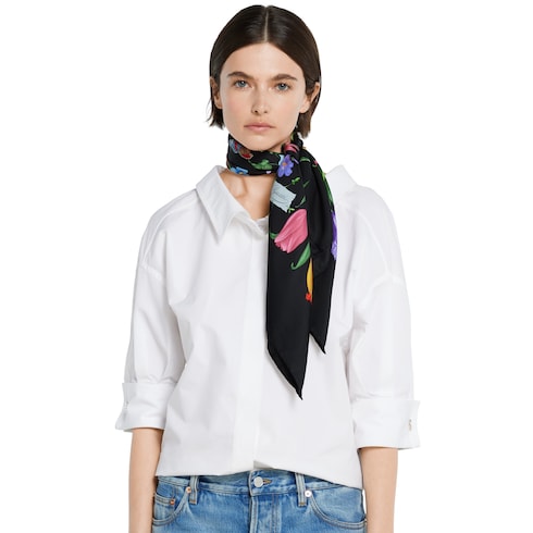 In the Spring Summer 2025 collection, vibrant silk accessories include this carré with the Gucci Flora pattern.